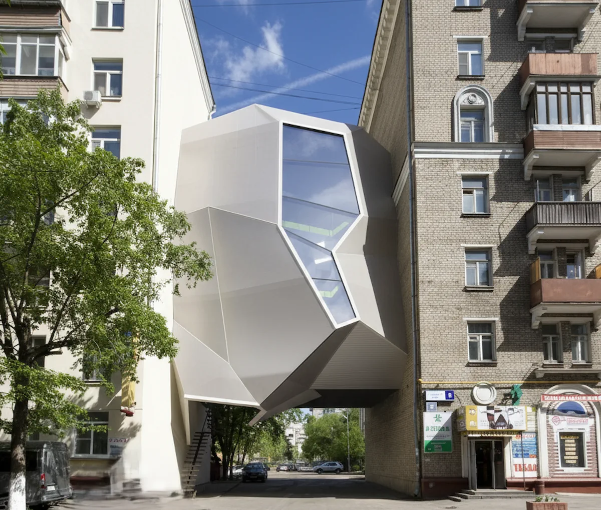 La obra es un estallido de deconstructivismo, una criatura alada de vidrio y acero que parece haberse posado de forma caótica sobre la azotea de un edificio de apartamentos tradicional y sobrio.